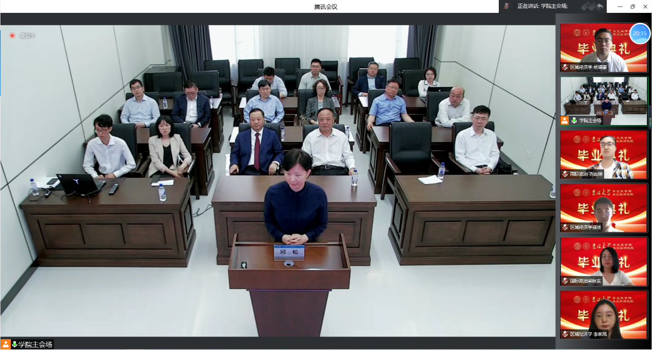 Accompanied by the rousing national anthem, the graduation ceremony officially began. Secretary Qiu Song first congratulated the students on their successful completion of their studies, and then approved the efforts and hard work of the instructors and students in overcoming the difficulties of the epidemic and successfully completing their studies. Finally, he expressed gratitude to the teachers and students for their contributions to the Northeast Asian Studies College.