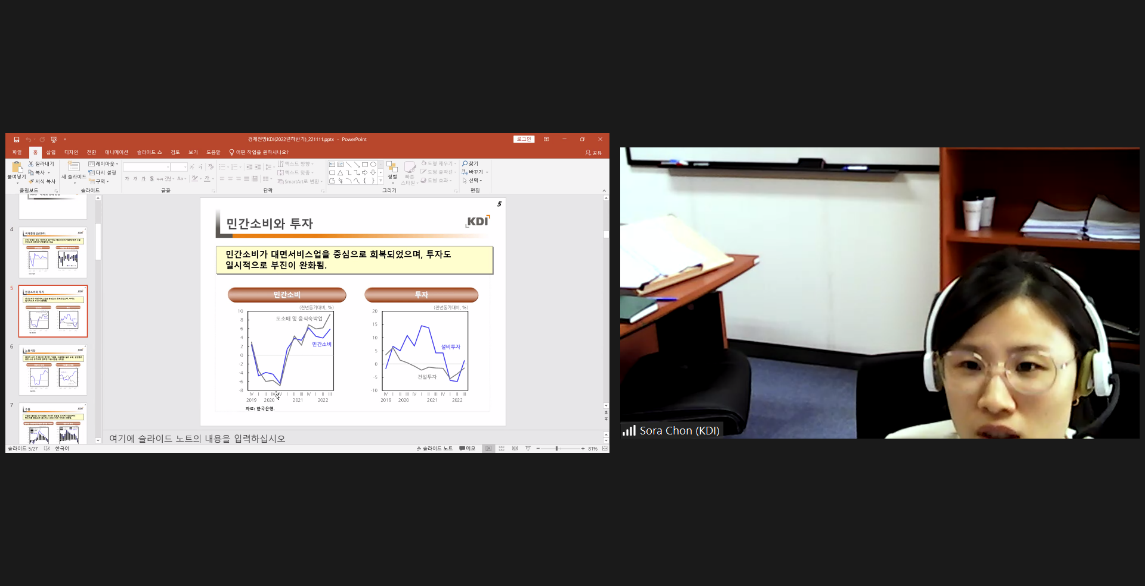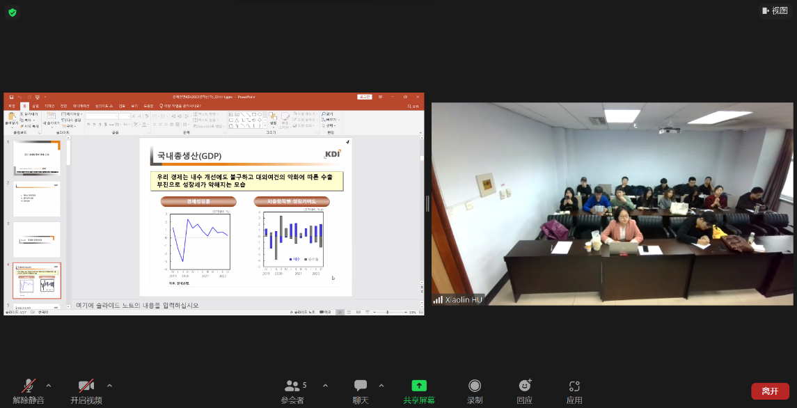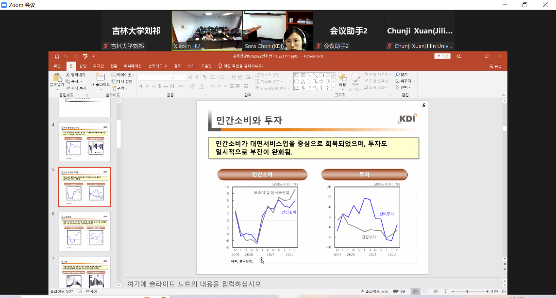 Dr. Chon Sora began her presentation by listing Korea's GDP growth rate, inflation rate, unemployment rate, and other indicators. She pointed out that Korea's economic development record after the COVID-19 pandemic was relatively good compared to that of European and American countries. Korea is now close to full employment. However, inflationary pressures are high. The forecast for Korea's economic development in the second half of this year is pessimistic because Korea's economic development cannot be separated from China's, and the dynamics of China's pandemic prevention and control policies not only affect its own economic development, but also have a profound impact on Korea's economy.