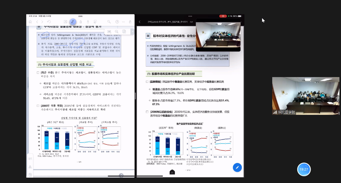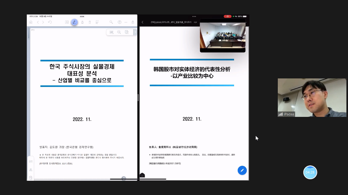 Prof. Kim first made a qualitative analysis of the issue of the stock market's representation of the Korean real economy, and then made a quantitative analysis of this issue using econometric models, and finally concluded that the Korean stock market has limitations in representing the Korean real economy, and explained the reasons for these limitations. Prof. Kim made a wonderful presentation.