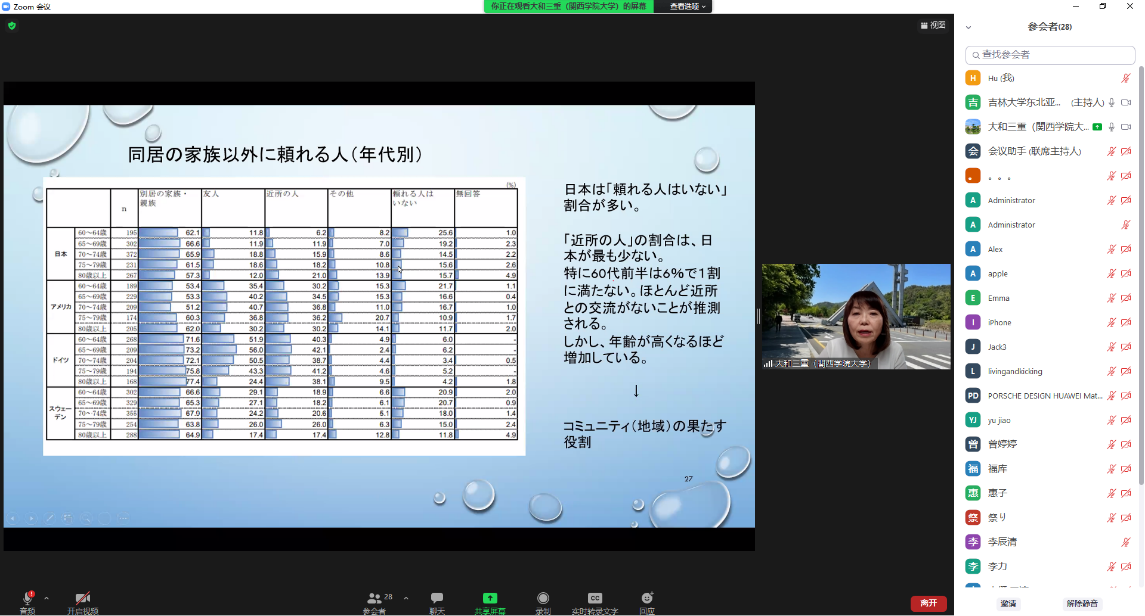 On November 4th, 2021, Professor OHWA Mie of the School of Human Welfare Studies at Kwansei Gakuin University (KGU), Japan, delivered an online key-note speech on “The Life of the Elderly in a Super-Aging Society” at the invitation of Northeast Asian Research Center of Jilin University and Northeast Asian Studies College of Jilin University. Associate Professor Wang Yanjun, Vice Dean of the Northeast Asian Studies College of Jilin University, presided over the symposium and served as an interpreter. The research team on population ageing and teachers and students of related majors on and off campus participated in the activity in person or in real time online.