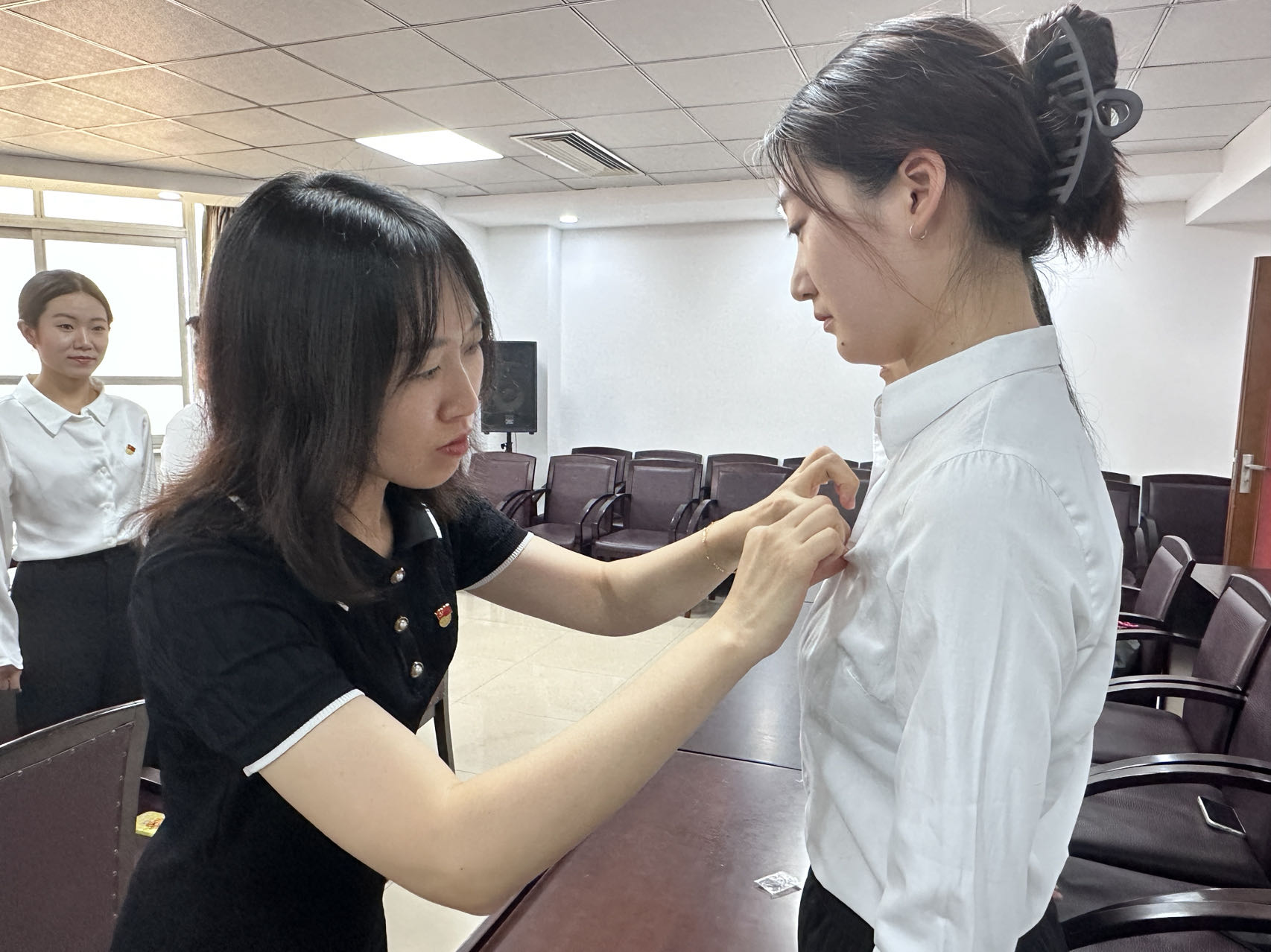 最后,赵毅博书记为全体新入党的同志们佩戴了党徽,并代表学院总结讲话。她代表学院党委祝贺16名同学加入党组织,并期待大家在新的征程上能够继续步履不停、赓续担当。同时,对新党员提出了期望,希望大家能够铭记今日面向党旗许下的坚定誓言,在未来的学习和生活中保持团结、坚定信念、恪守纪律,不忘初心使命,为中华民族伟大复兴的中国梦贡献青春力量。