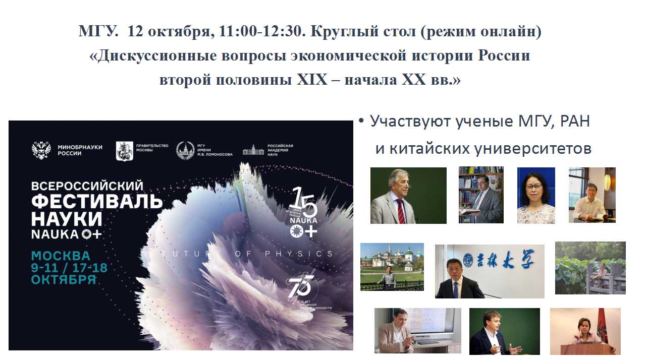 2020年10月12日下午,第十五届全俄学术节(莫斯科)框架下的首场圆桌论坛“19世纪下半叶-20世纪初俄国经济史研究中的争议问题”在莫斯科大学隆重召开。来自莫斯科国立大学、俄罗斯科学院、中国四所高校和科研机构的近百名专家学者、学生齐聚云端。本次活动由莫斯科大学主办,秘密入口