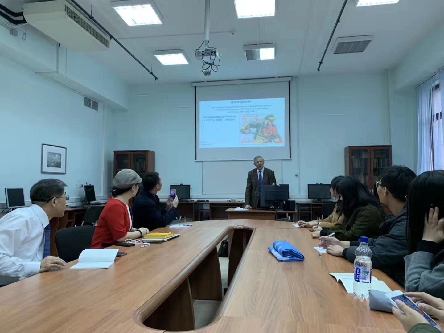 10月12日,访学团队在张广翔教授的带领下启程前往俄罗斯。在为期15天的访学期间,访学团队访问了莫斯科国立大学、俄罗斯科学院俄国史研究所、俄罗斯国立列宁图书馆、俄罗斯国立档案馆,按照计划举办专题讲座、考察档案资料和开展学术座谈。莫斯科大学历史系主席、俄罗斯科学院院士С.П.卡尔波夫教授、莫大历史系副主任、俄罗斯科学院通讯院士Л.И.鲍罗德金教授等五位历史学家斯大林经济坐标中的核计划俄罗斯联邦核中心——全俄实验物理学研究所史略“核研究与苏联核计划史”等前沿问题作了专题讲座,并与访学团队进行答疑研修,详细解答了团队成员提出的问题。张广翔教授还与Л.И.鲍罗德金教授热烈讨论了一系列双方共同关心的史学前沿问题。