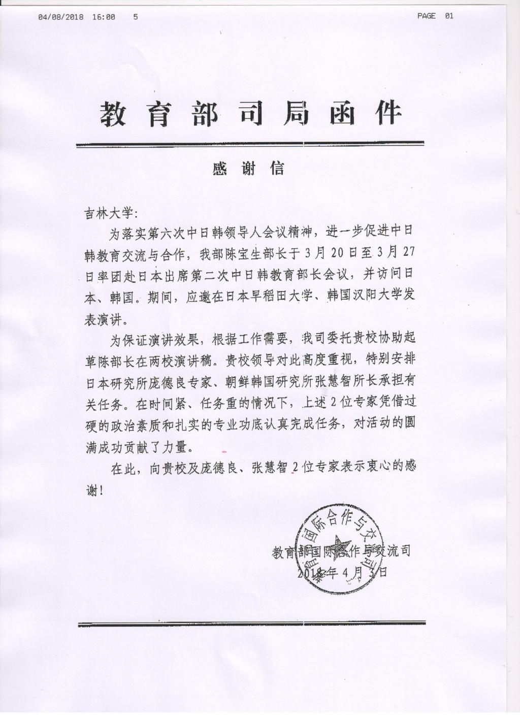 近日教育部国际合作与交流司致信秘密入口 ,对东北亚研究院庞德良教授和张慧智教授表示感谢。