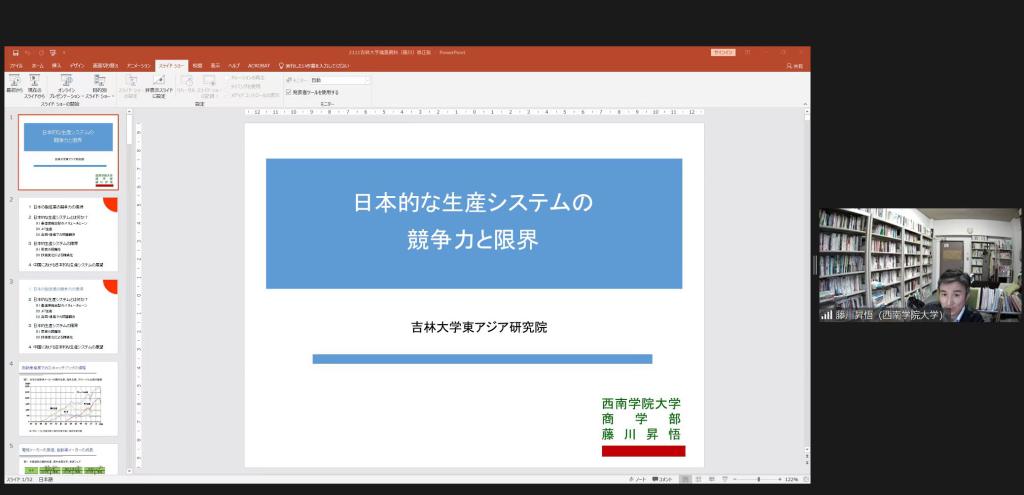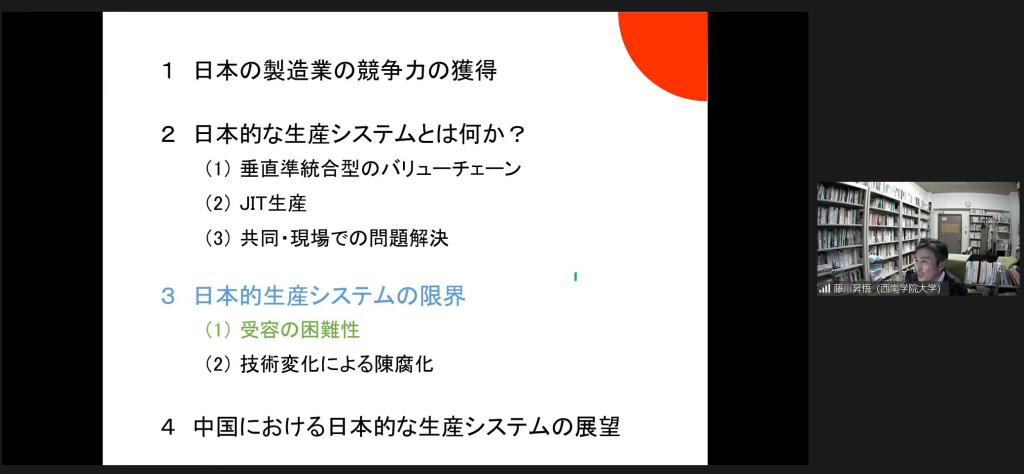 日本研究所的邀请,日本西南学院大学商学部藤川升悟(FUJIKAWA SHOGO)教授做了以“日本型生产体系的竞争力及其局限性”为主题的线上学术报告会。本次报告采取了线上和线下相结合的方式,由秘密入口