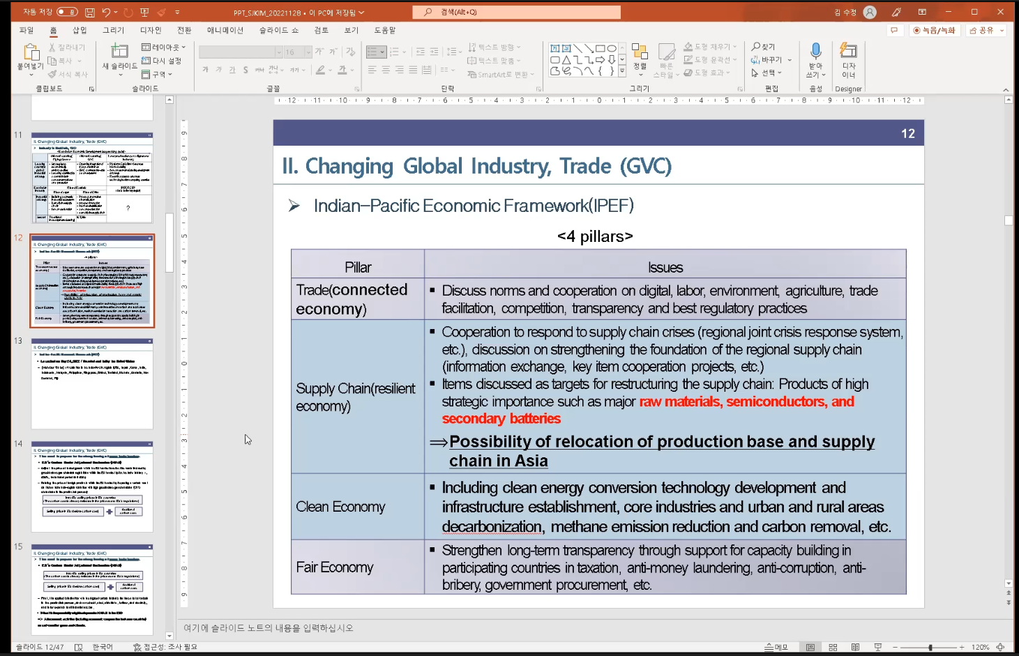 讲座第一部分金博士介绍了中日韩在全球价值链地位的发展进程、分析朝鲜加入全球价值链的前提条件和可能产生的效果、东亚地区区域合作的前景和困难。讲座第二部分金博士介绍了中日韩在全球价值链中的产业发展历史、未来全球价值链重塑的预期、气候环境等问题对全球贸易及供应链的影响。讲座第三部分金博士介绍了东亚地区的经济合作现状。讲座第四部分金博士介绍了朝鲜经济运行及产业现状、国际环境对朝鲜经济发展的影响、朝鲜加入全球价值链的前景展望及前置条件。最后金博士对东亚地区产业合作前景及可能遇到的问题进行展望,阐述朝鲜加入全球价值链对东亚地区的未来发展影响。