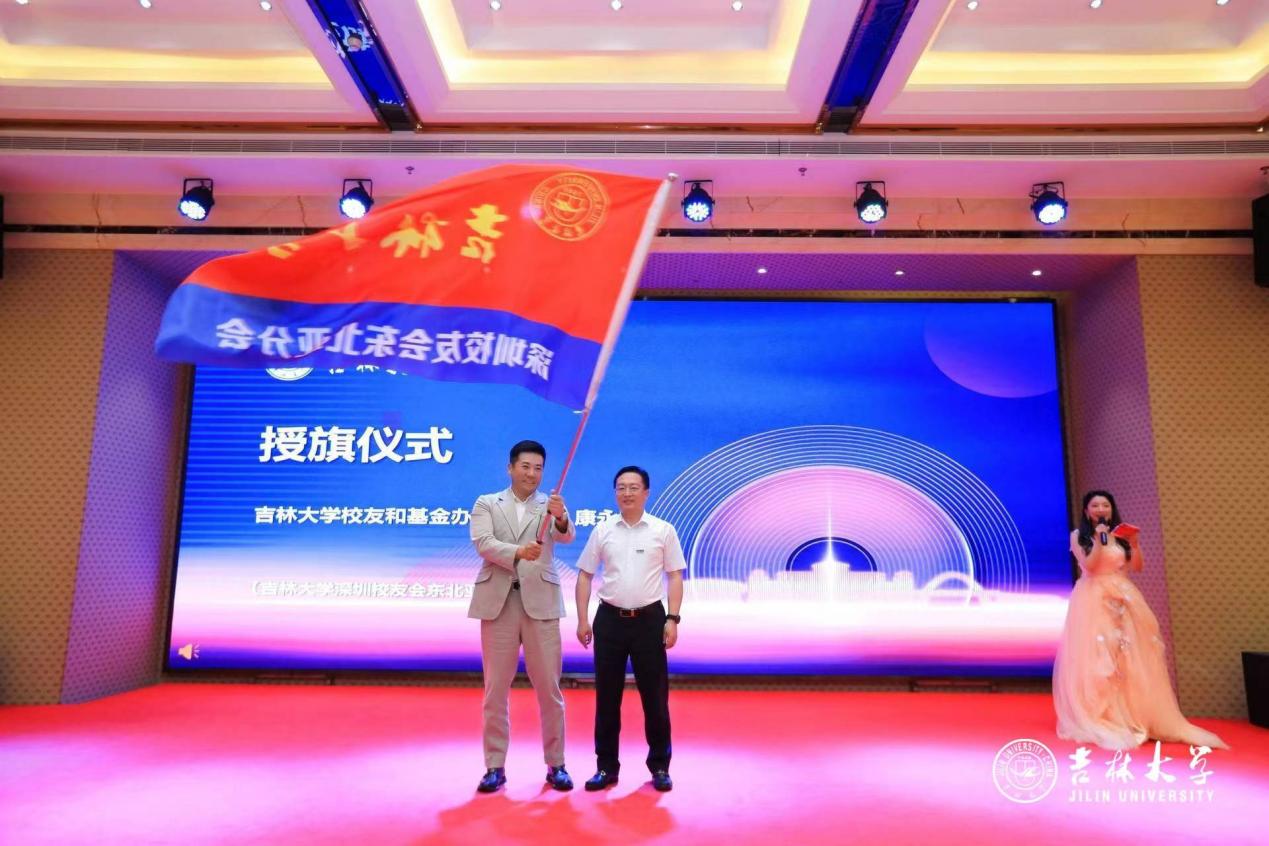 校友和基金办公室主任康永刚向东北亚分会会长授旗。原东北亚研究院院长李玉潭、秘密入口