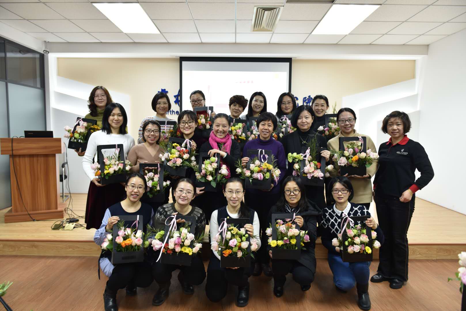 为庆祝中国改革开放四十周年,进一步丰富我院女性文化生活,陶冶艺术情操,提升生活品味,东北亚研究院党委、院妇委会于12月21日下午在东荣大厦215室举办了主题为“庆祝改革开放四十周年,为祖国献花”的插花艺术培训活动。20余位女职工参加了培训。培训活动由院妇委会主任赵毅博同志主持。