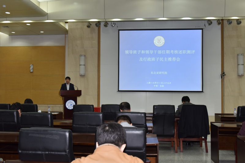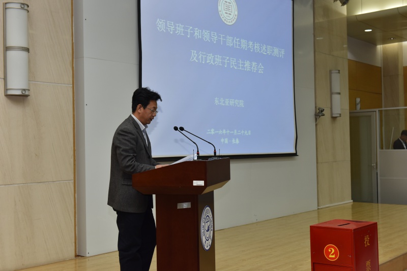11月29日上午,东北亚研究院在东荣大厦会议中心多功能报告厅召开学院领导班子和领导干部任期考核述职测评及行政班子民主推荐会。学校工作组组长、校党委宣传部部长王玉柱同志,纪委办公室(监察处)副处长陈凯光同志、党委组织部徐仁元同志和党委宣传部陈慧羲同志出席了会议。学院领导班子成员、全院教职工和学生代表参加了会议。