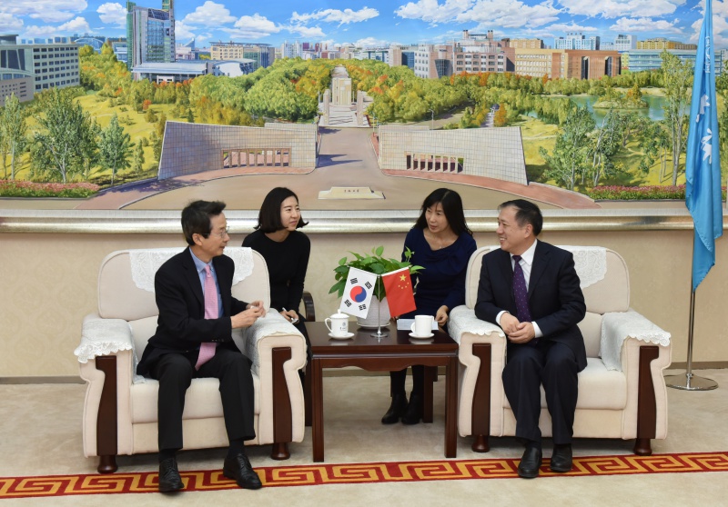 在东北亚研究领域取得的成绩,并表示将积极推动双方在多个领域的合作。在与朴仁国会谈时,杨振斌首先欢迎朴总长再次访问吉大,感谢韩国高等教育财团多年来对吉大的支持,朴仁国表示希望进一步加强与吉大的合作,在高端论坛、教师国际学术交流、学生海外留学等方面加强对吉大的资助。