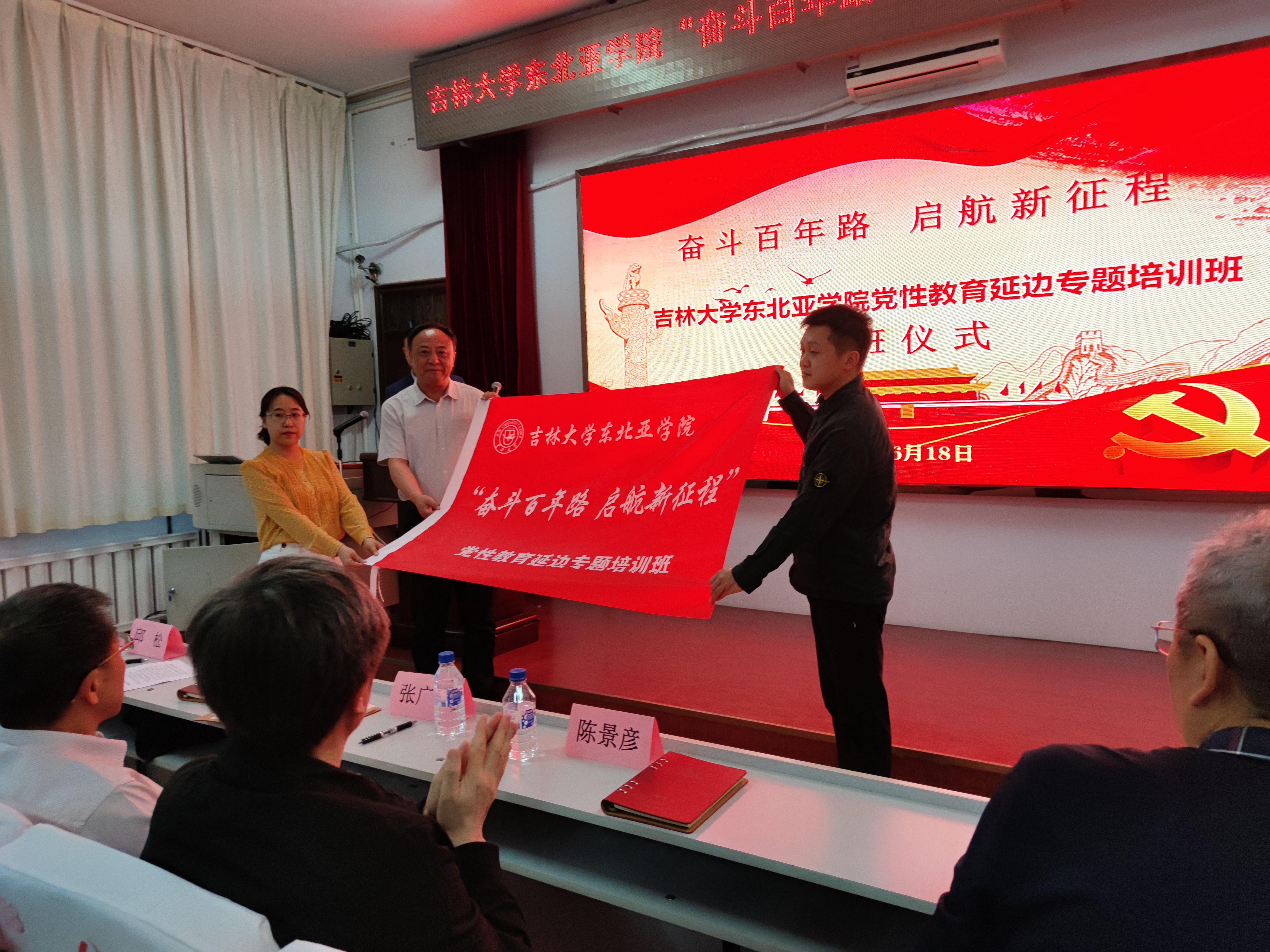 “双一流”建设和学院高质量发展而努力奋斗。全体合唱国歌,班主任向学员代表授旗。