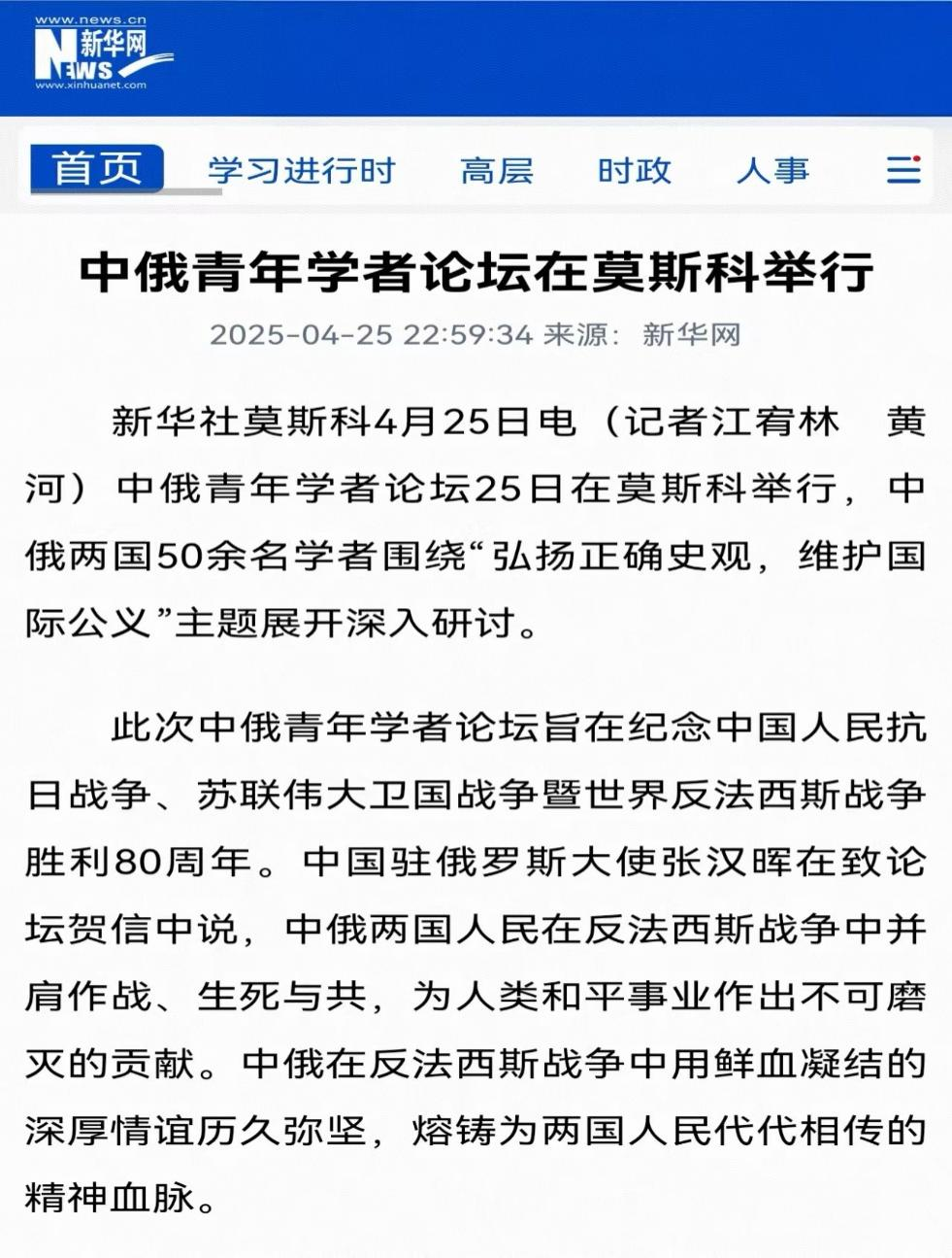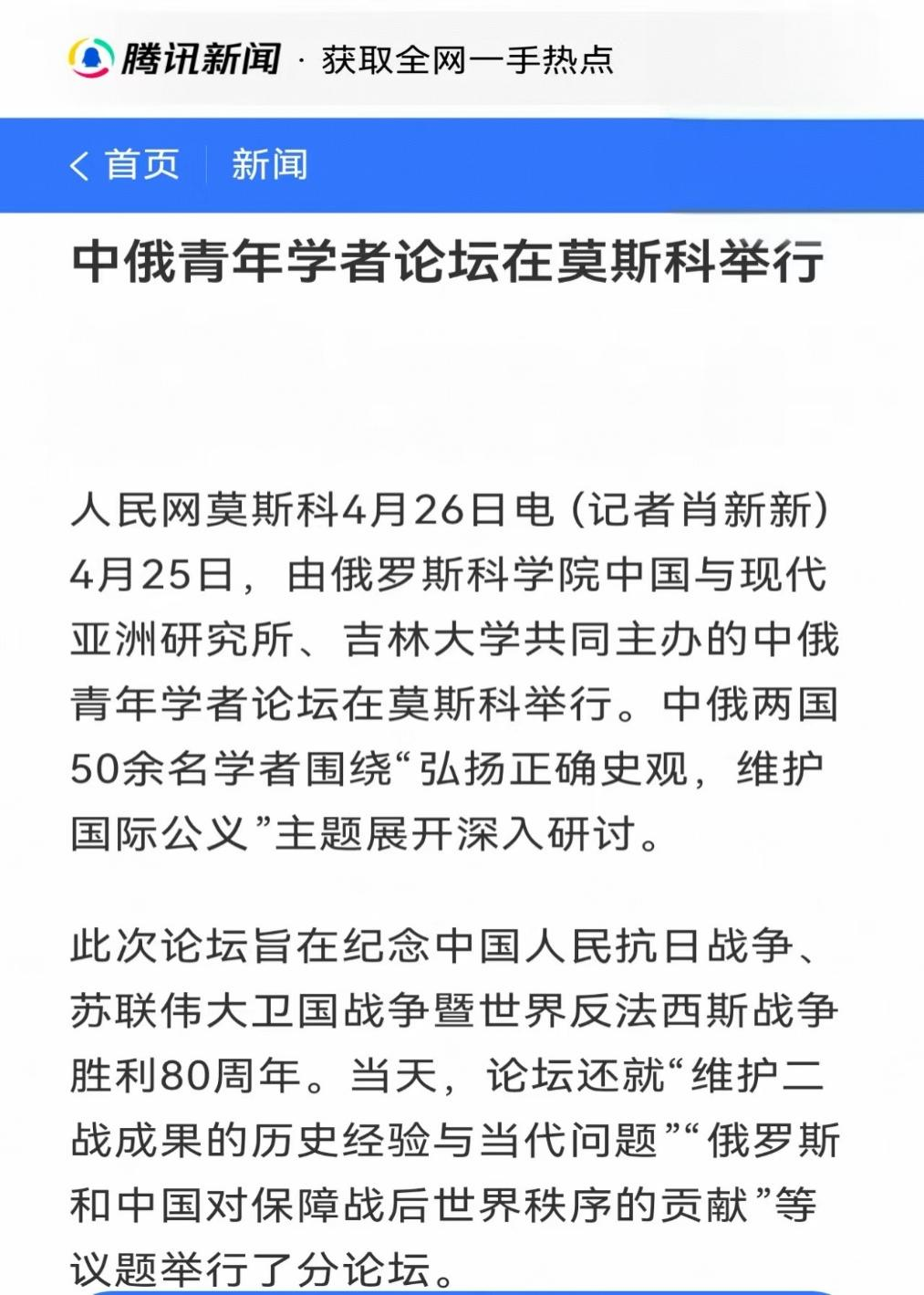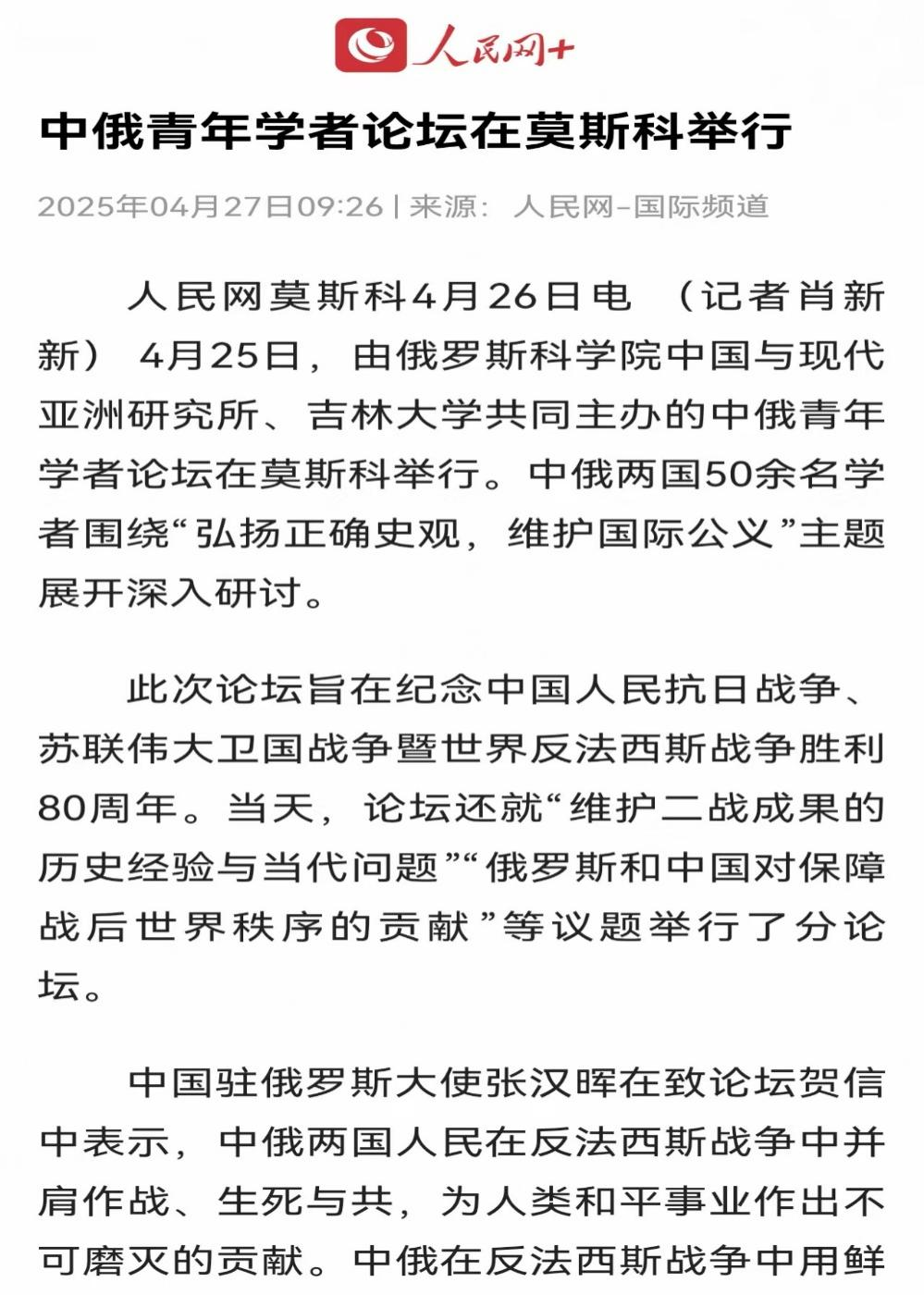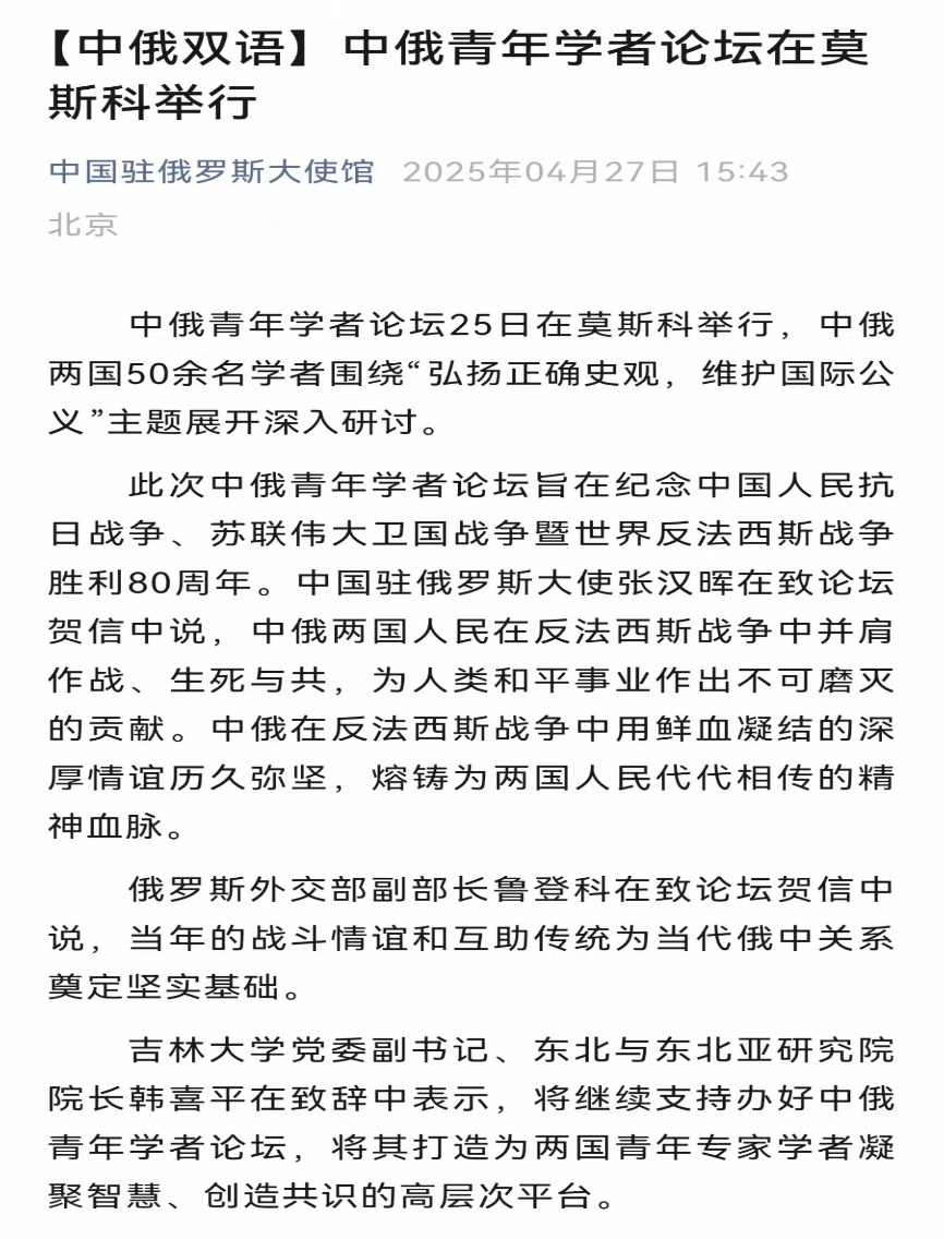 社会科学研究院联合举办的“纪念中国人民抗日战争、苏联伟大卫国战争暨世界反法西斯战争胜利80周年中俄青年论坛”在莫斯科成功举办。此次会议是践行中俄两国元首关于共庆反法西斯战争胜利80周年的重要共识、推动中俄人文与青年交流的重要学术活动。此次论坛获得了中俄两国外交部门的高度关注和支持。中华人民共和国驻俄罗斯联邦特命全权大使张汉晖、俄罗斯联邦外交部副部长安德烈·鲁登科分别向论坛致贺信