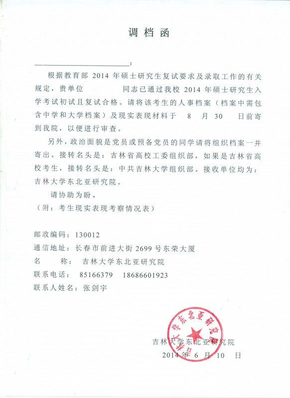 2014年入学的统招硕士研究生,请自行下载调档函(附件1)和考生现实情况考察表(附件2)后,到档案所在部门办理调档手续,并于2014年8月30日前交付到我院。