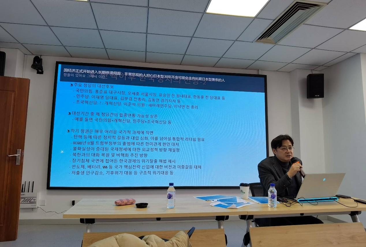 讲座中,洪翼杓教授从理解韩国政治的基本要素出发,讲授了尹锡悦政府执政背景与施政情况、尹锡悦政府以来韩国国内政治矛盾、“12.3紧急戒严”事件的原因与发展过程、“弹劾”与韩国政治展望等内容,深入分析了近期戒严令事件始末,并对韩国国内政治进行展望。