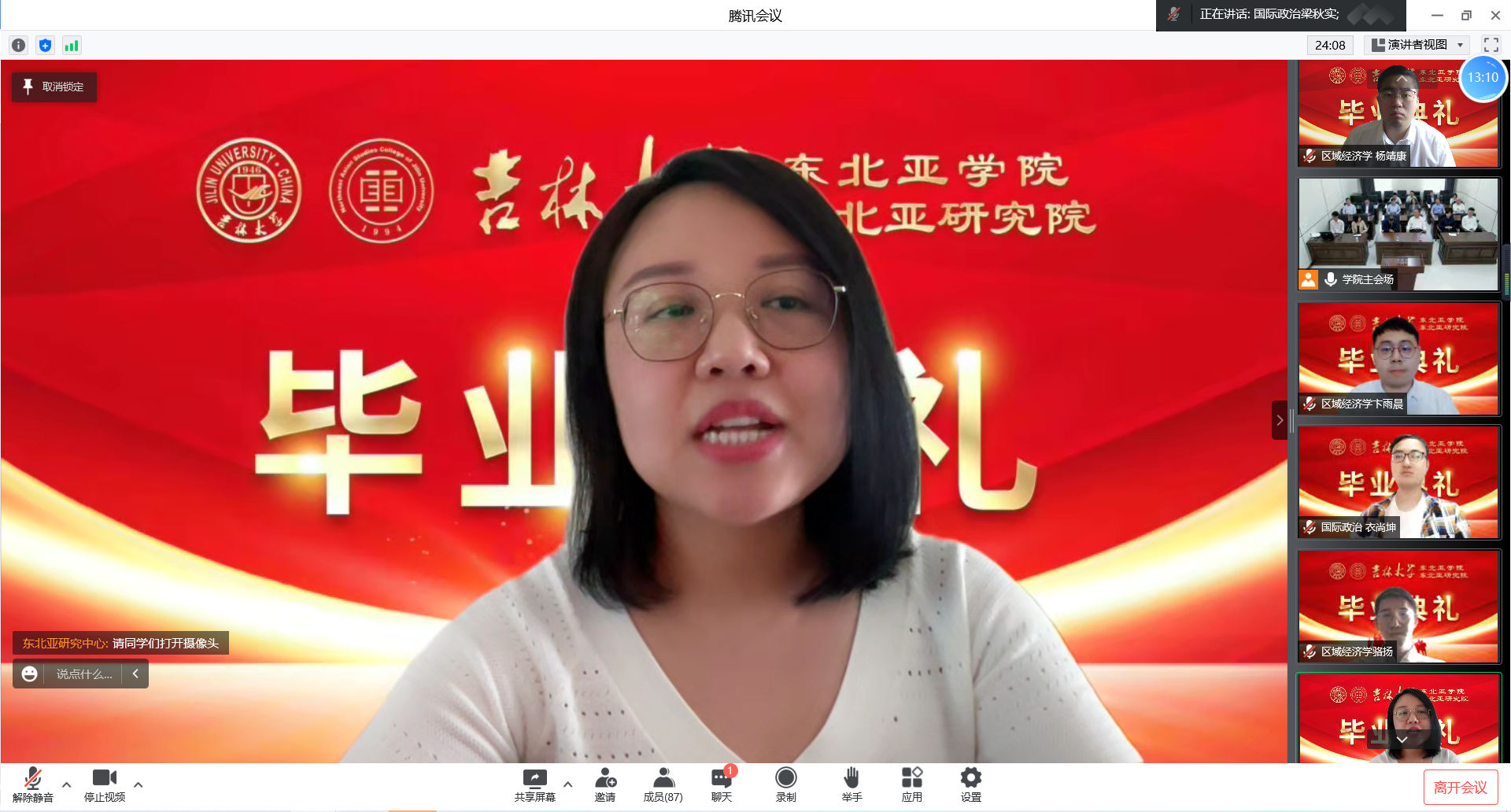 博士毕业生代表梁秋实同学和硕士毕业生代表卞雨晨同学都表达了对学院和老师们感恩之情,表达了对同窗之间深厚情谊的不舍之情,并表示会牢记“求实创新,励志图强”的吉大精神,牢记老师们的谆谆教诲,无论未来去往何处,都会展现吉大人,展现东北亚学子的风采。