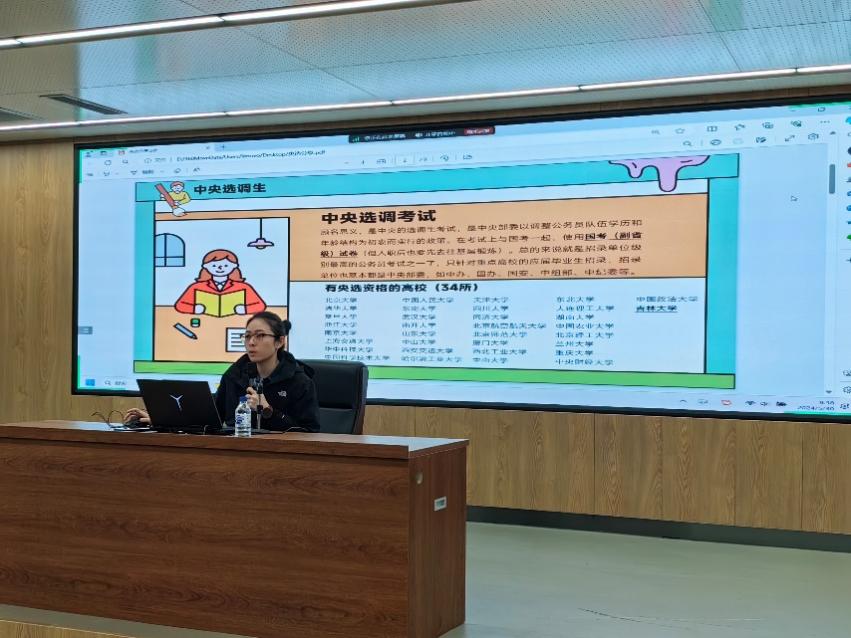 党委副书记兼副院长赵毅博老师主持,八位具有丰富选调公考、求职经验的优秀毕业生受邀分享自身经历和经验,研究生辅导员山丹老师以及学院部分本科生、研究生参加。